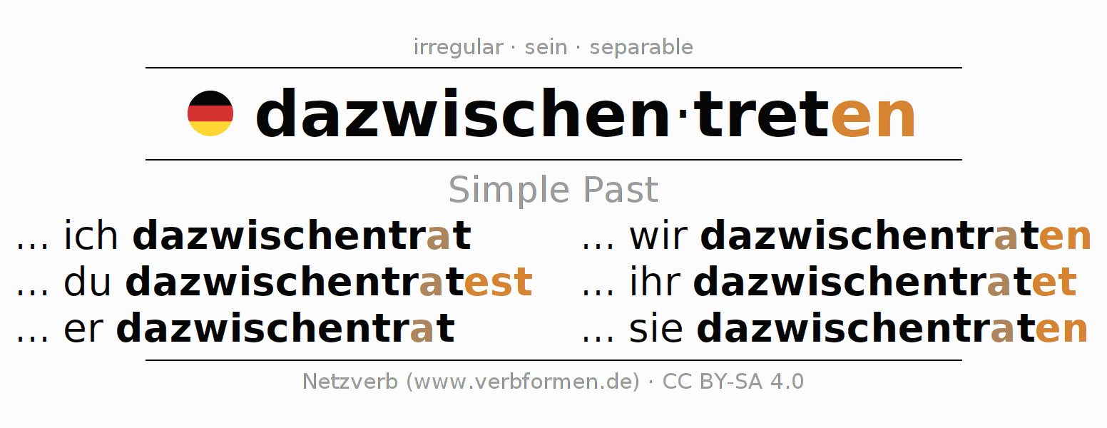 The verb dazwischentreten fully conjugated in all persons and numbers in the Imperfect Indicative