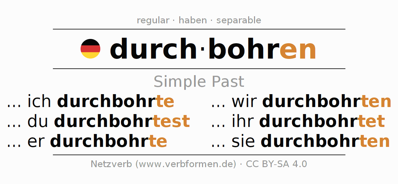 The conjugation of durchbohren in Imperfect Indicative Past Active is ... ich durchbohrte, ... du durchbohrtest, ... er durchbohrte, ... wir durchbohrten, ... ihr durchbohrtet, ... sie durchbohrten.The conjugation corresponds to certain grammatical rules. Likewise the requirements for the conjugation of the simple verb forms of durchbohren in Imperfect. Comments ☆