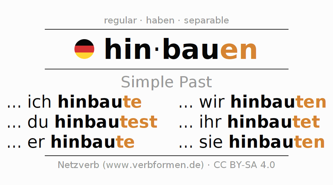 The conjugation of hinbauen in Imperfect Indicative Past Active is ... ich hinbaute, ... du hinbautest, ... er hinbaute, ... wir hinbauten, ... ihr hinbautet, ... sie hinbauten.The conjugation corresponds to certain grammatical rules. Likewise the requirements for the conjugation of the simple verb forms of hinbauen in Imperfect. Comments ☆