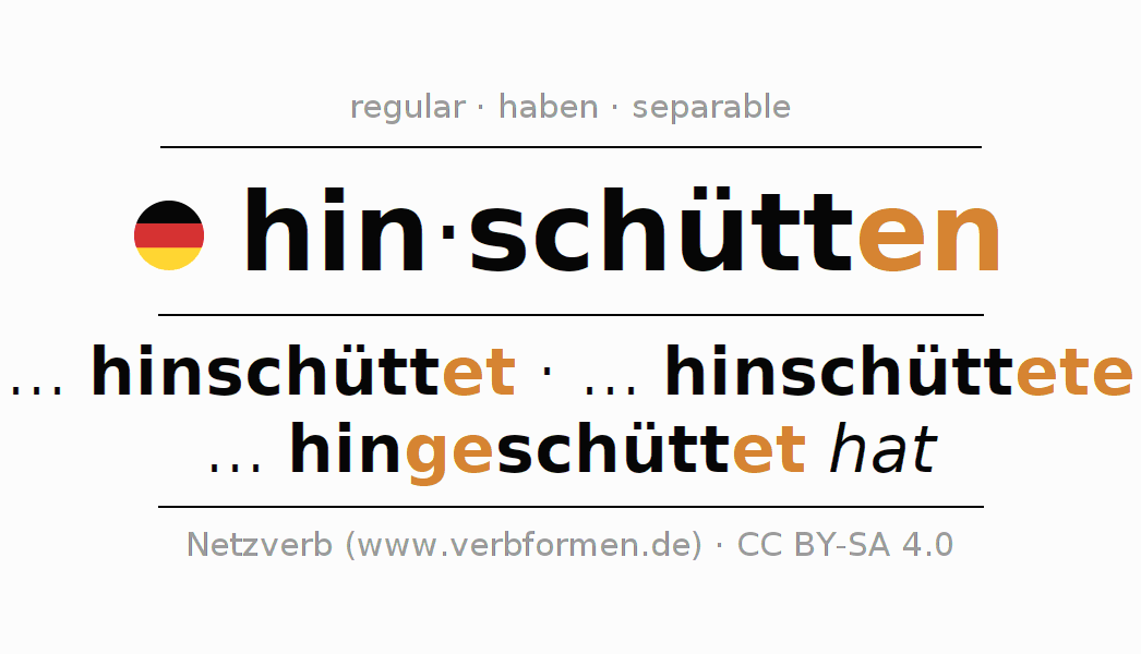 The conjugation of hinschütten in Imperfect Indicative Past Active is ... ich hinschüttete, ... du hinschüttetest, ... er hinschüttete, ... wir hinschütteten, ... ihr hinschüttetet, ... sie hinschütteten.The conjugation corresponds to certain grammatical rules. Likewise the requirements for the conjugation of the simple verb forms of hinschütten in Imperfect. Comments ☆