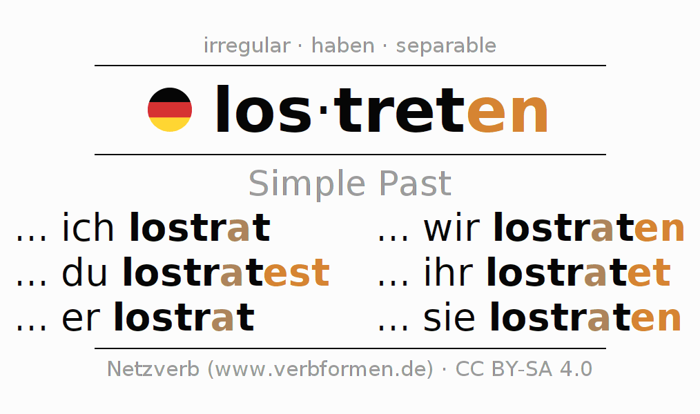 The conjugation of lostreten in Imperfect Indicative Past Active is ... ich lostrat, ... du lostrat(e)st, ... er lostrat, ... wir lostraten, ... ihr lostratet, ... sie lostraten.The conjugation corresponds to certain grammatical rules. Likewise the requirements for the conjugation of the simple verb forms of lostreten in Imperfect. Comments ☆