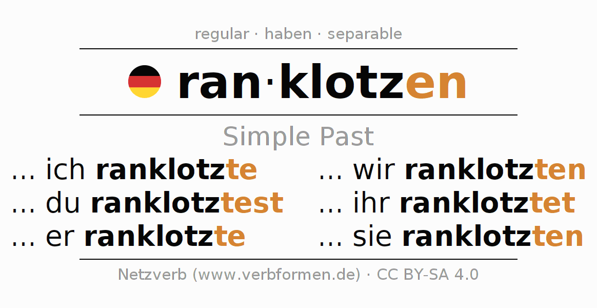 The conjugation of ranklotzen in Imperfect Indicative Past Active is ... ich ranklotzte, ... du ranklotztest, ... er ranklotzte, ... wir ranklotzten, ... ihr ranklotztet, ... sie ranklotzten.The conjugation corresponds to certain grammatical rules. Likewise the requirements for the conjugation of the simple verb forms of ranklotzen in Imperfect. Comments ☆