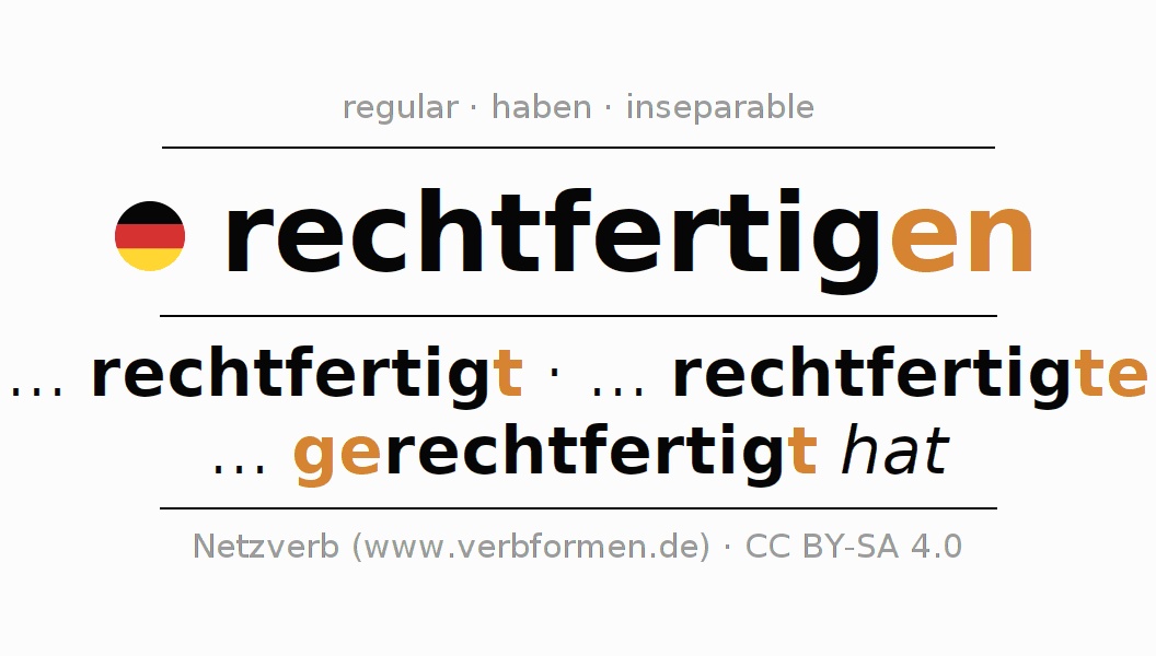 The conjugation of rechtfertigen in Imperfect Indicative Past Active is ... ich rechtfertigte, ... du rechtfertigtest, ... er rechtfertigte, ... wir rechtfertigten, ... ihr rechtfertigtet, ... sie rechtfertigten.The conjugation corresponds to certain grammatical rules. Likewise the requirements for the conjugation of the simple verb forms of rechtfertigen in Imperfect. Comments ☆