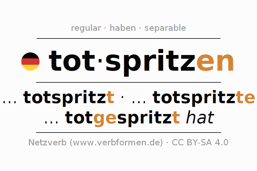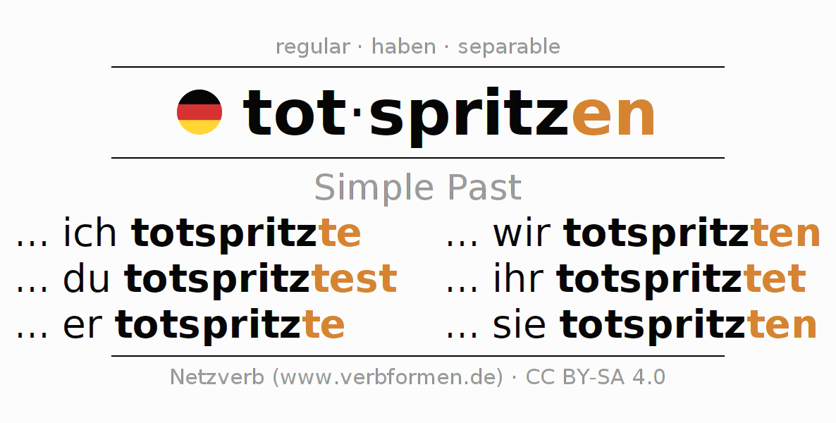 The verb totspritzen fully conjugated in all persons and numbers in the Imperfect Indicative
