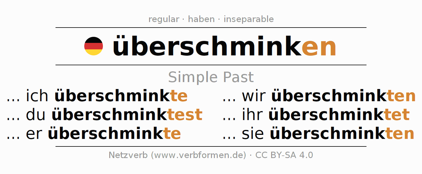 The conjugation of überschminken in Imperfect Indicative Past Active is ... ich überschminkte, ... du überschminktest, ... er überschminkte, ... wir überschminkten, ... ihr überschminktet, ... sie überschminkten.The conjugation corresponds to certain grammatical rules. Likewise the requirements for the conjugation of the simple verb forms of überschminken in Imperfect. Comments ☆