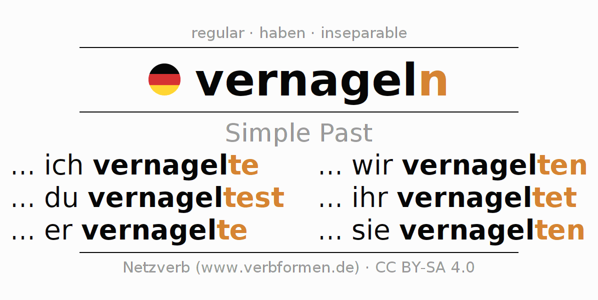 The verb vernageln fully conjugated in all persons and numbers in the Imperfect Indicative