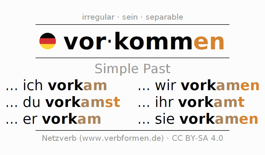 The verb vorkommen fully conjugated in all persons and numbers in the Imperfect Indicative