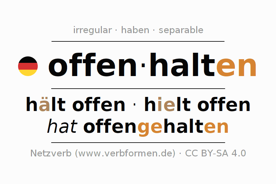 The conjugation of offenhalten (allow retreat, be generous) in the past tense is ich hielt offen, du hielt(e)st offen, er hielt offen, wir hielten offen, ihr hieltet offen, sie hielten offen. As an irregular, strong verb with ablaut -ie- the preterite stem hielt- is used. The preterite endings -est, -en, -et, -en are appended to this stem. The 1st and 3rd person singular have no endings.The endings of the 2nd persons are extended by "e", since the stem ends on -t.The prefix offen- of offenhalten is separated.The conjugation of these forms conforms to the grammatical rules for verbs in the past tense. Comments ☆