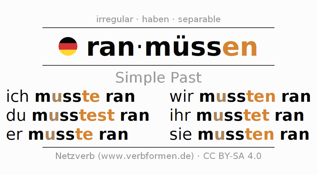 The conjugation of ranmüssen (have to get closer, have to muck in) in the past tense is ich musste ran, du musstest ran, er musste ran, wir mussten ran, ihr musstet ran, sie mussten ran. As an irregular verb is the changed preterite stem muss- used. The preterite endings -te, -test, -te, -ten, -tet, -ten are appended to this stem.The prefix ran- of ranmüssen is separated.The conjugation of these forms conforms to the grammatical rules for verbs in the past tense. Comments ☆