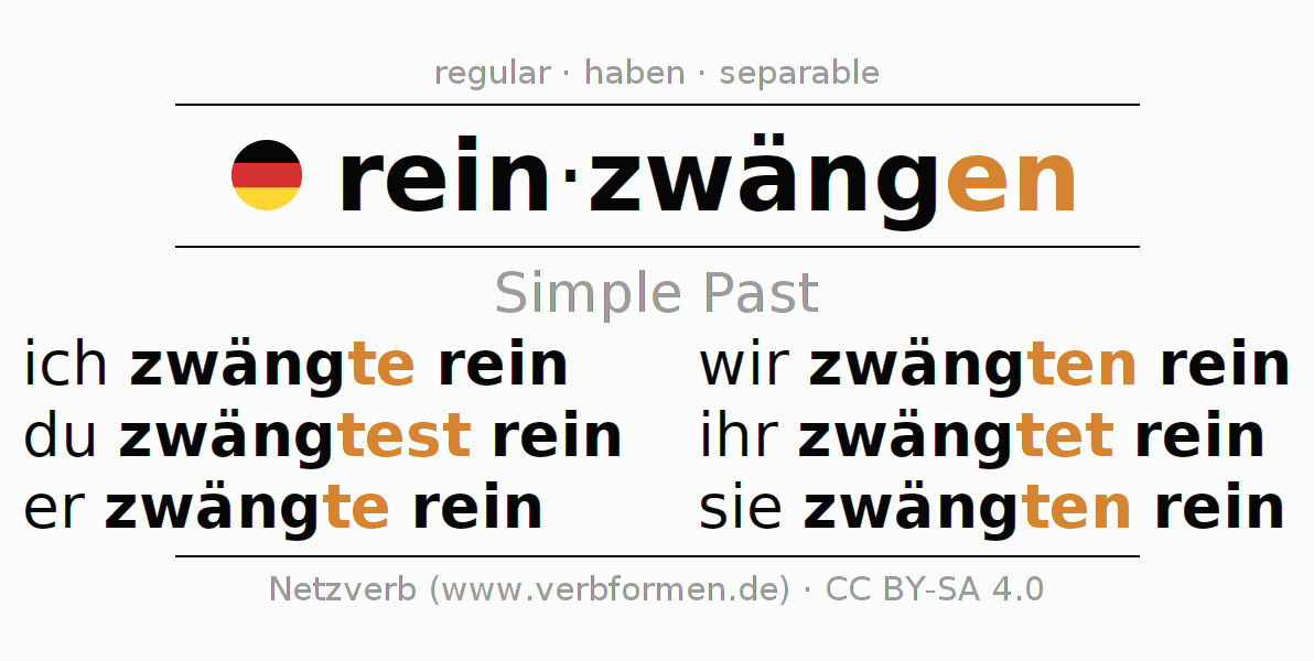 The conjugation of reinzwängen (force in, squeeze in) in the past tense is ich zwängte rein, du zwängtest rein, er zwängte rein, wir zwängten rein, ihr zwängtet rein, sie zwängten rein. As a regular verb the unmodified stem zwäng- is used. The preterite endings -te, -test, -te, -ten, -tet, -ten are appended to this stem.The prefix rein- of reinzwängen is separated.The conjugation of these forms conforms to the grammatical rules for verbs in the past tense. Comments ☆