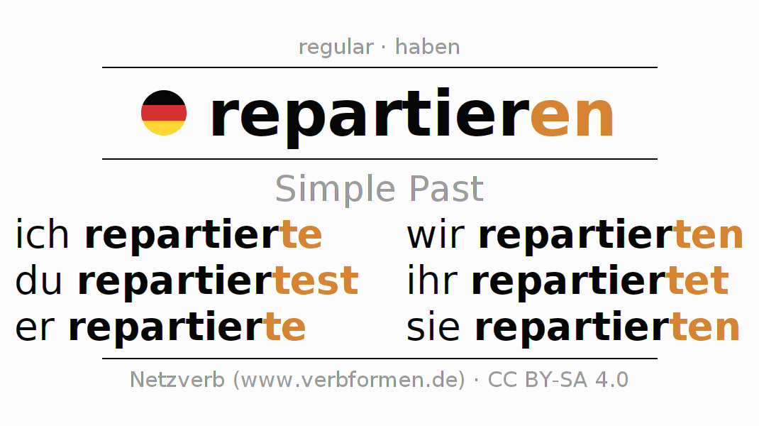 The conjugation of repartieren (apportion, allocate) in the past tense is ich repartierte, du repartiertest, er repartierte, wir repartierten, ihr repartiertet, sie repartierten. As a regular verb the unmodified stem repartier- is used. The preterite endings -te, -test, -te, -ten, -tet, -ten are appended to this stem.The conjugation of these forms conforms to the grammatical rules for verbs in the past tense. Comments ☆