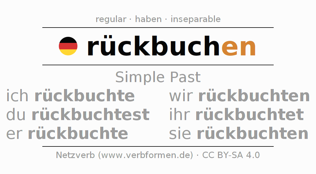 The conjugation of rückbuchen (reverse, undo) in the past tense is ich rückbuchte, du rückbuchtest, er rückbuchte, wir rückbuchten, ihr rückbuchtet, sie rückbuchten. As a regular verb the unmodified stem buch- is used. The preterite endings -te, -test, -te, -ten, -tet, -ten are appended to this stem.The conjugation of these forms conforms to the grammatical rules for verbs in the past tense. Comments ☆