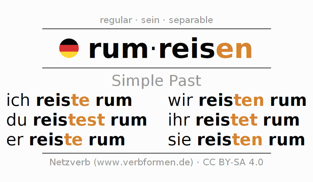 The conjugation of rumreisen (travel aimlessly, wander) in the past tense is ich reiste rum, du reistest rum, er reiste rum, wir reisten rum, ihr reistet rum, sie reisten rum. As a regular verb the unmodified stem reis- is used. The preterite endings -te, -test, -te, -ten, -tet, -ten are appended to this stem.The prefix rum- of rumreisen is separated.The conjugation of these forms conforms to the grammatical rules for verbs in the past tense. Comments ☆