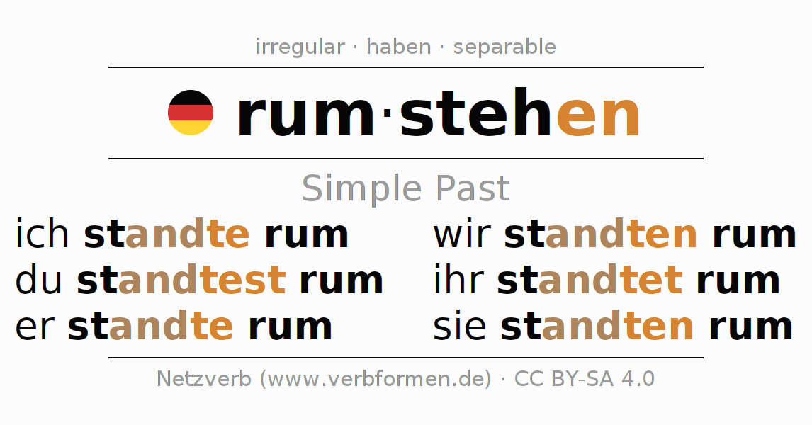 The conjugation of rumstehen (loiter, stand around) in the past tense is ich standte rum, du standtest rum, er standte rum, wir standten rum, ihr standtet rum, sie standten rum. As an irregular verb is the changed preterite stem stand- used. The preterite endings -te, -test, -te, -ten, -tet, -ten are appended to this stem.The prefix rum- of rumstehen is separated.The conjugation of these forms conforms to the grammatical rules for verbs in the past tense. Comments ☆