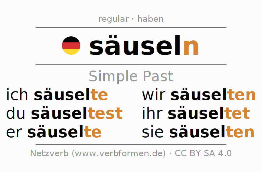 The conjugation of säuseln (whisper, murmur) in the past tense is ich säuselte, du säuseltest, er säuselte, wir säuselten, ihr säuseltet, sie säuselten. As a regular verb the unmodified stem säusel- is used. The preterite endings -te, -test, -te, -ten, -tet, -ten are appended to this stem.The conjugation of these forms conforms to the grammatical rules for verbs in the past tense. Comments ☆