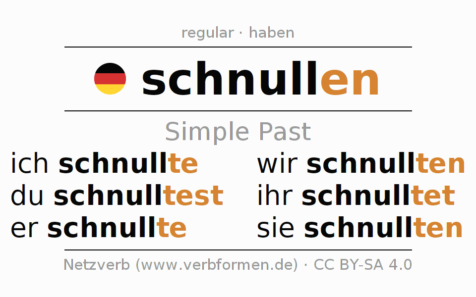 The conjugation of schnullen (nurse, suck) in the past tense is ich schnullte, du schnulltest, er schnullte, wir schnullten, ihr schnulltet, sie schnullten. As a regular verb the unmodified stem schnull- is used. The preterite endings -te, -test, -te, -ten, -tet, -ten are appended to this stem.The conjugation of these forms conforms to the grammatical rules for verbs in the past tense. Comments ☆