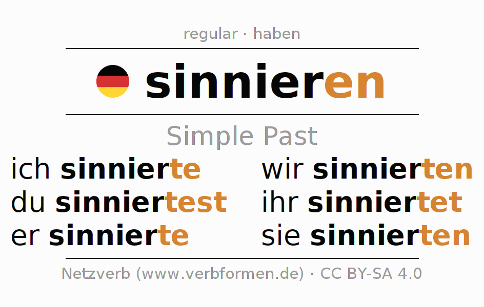 The conjugation of sinnieren (muse, ponder) in the past tense is ich sinnierte, du sinniertest, er sinnierte, wir sinnierten, ihr sinniertet, sie sinnierten. As a regular verb the unmodified stem sinnier- is used. The preterite endings -te, -test, -te, -ten, -tet, -ten are appended to this stem.The conjugation of these forms conforms to the grammatical rules for verbs in the past tense. Comments ☆