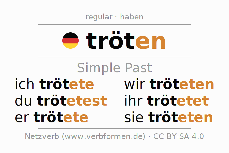 The conjugation of tröten (hoot, toot) in the past tense is ich trötete, du trötetest, er trötete, wir tröteten, ihr trötetet, sie tröteten. As a regular verb the unmodified stem tröt- is used. The preterite endings -ete, -etest, -ete, -eten, -etet, -eten are appended to this stem.The endings are extended by "e", as the stem ends on -t.The conjugation of these forms conforms to the grammatical rules for verbs in the past tense. Comments ☆