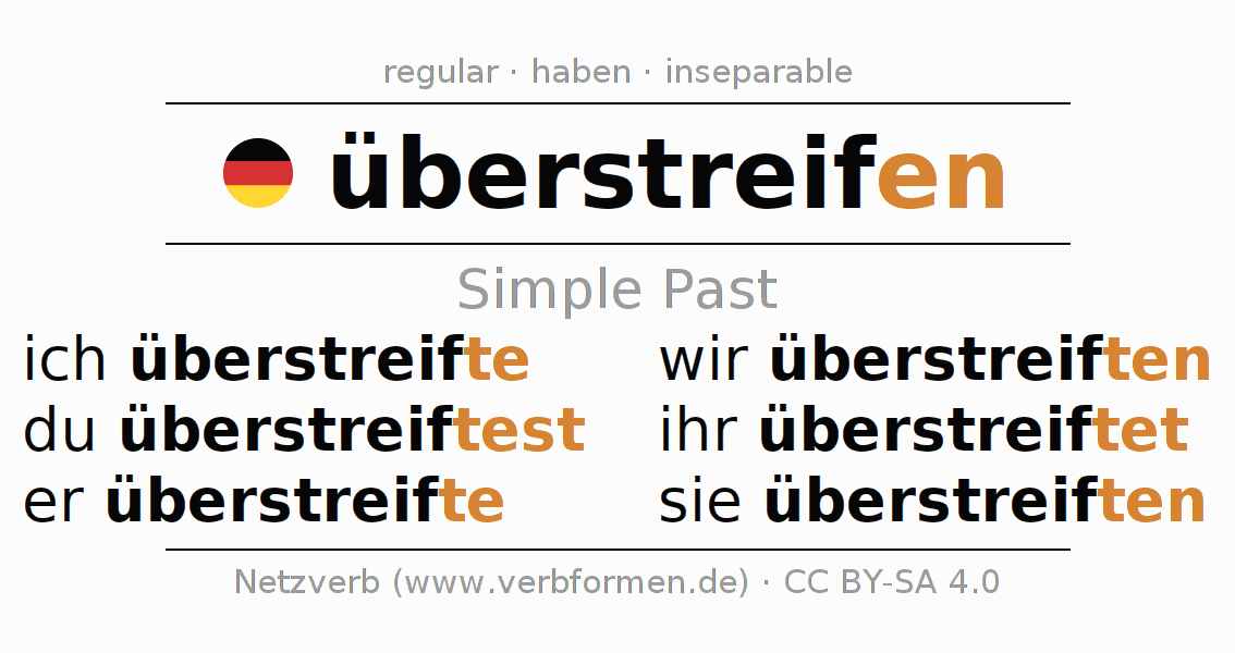 The conjugation of überstreifen (slip on, pull over) in the past tense is ich überstreifte, du überstreiftest, er überstreifte, wir überstreiften, ihr überstreiftet, sie überstreiften. As a regular verb the unmodified stem streif- is used. The preterite endings -te, -test, -te, -ten, -tet, -ten are appended to this stem.The conjugation of these forms conforms to the grammatical rules for verbs in the past tense. Comments ☆