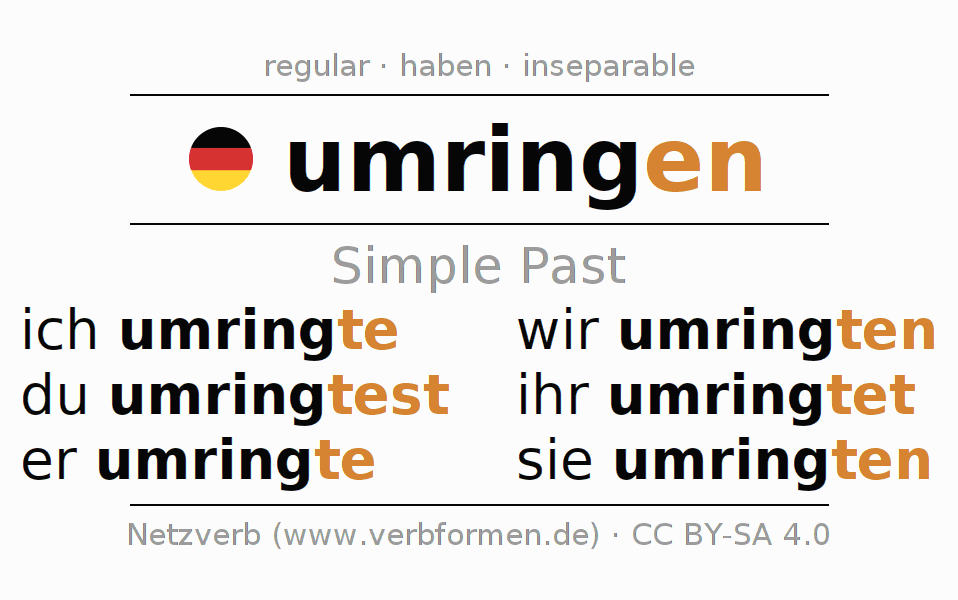 The conjugation of umringen (encircle, surround) in the past tense is ich umringte, du umringtest, er umringte, wir umringten, ihr umringtet, sie umringten. As a regular verb the unmodified stem ring- is used. The preterite endings -te, -test, -te, -ten, -tet, -ten are appended to this stem.The conjugation of these forms conforms to the grammatical rules for verbs in the past tense. Comments ☆