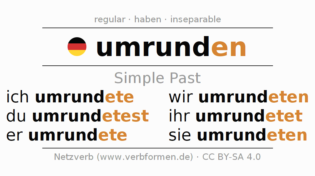 The conjugation of umrunden (circle, orbit) in the past tense is ich umrundete, du umrundetest, er umrundete, wir umrundeten, ihr umrundetet, sie umrundeten. As a regular verb the unmodified stem rund- is used. The preterite endings -ete, -etest, -ete, -eten, -etet, -eten are appended to this stem.The endings are extended by "e", as the stem ends on -d.The conjugation of these forms conforms to the grammatical rules for verbs in the past tense. Comments ☆