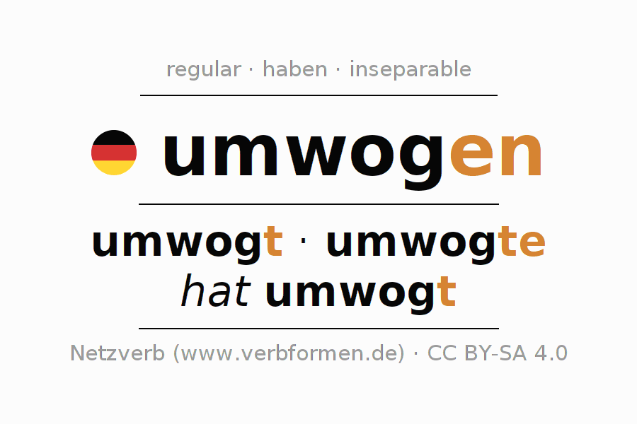 The conjugation of umwogen (flow around, enveloping) in the past tense is ich umwogte, du umwogtest, er umwogte, wir umwogten, ihr umwogtet, sie umwogten. As a regular verb the unmodified stem wog- is used. The preterite endings -te, -test, -te, -ten, -tet, -ten are appended to this stem.The conjugation of these forms conforms to the grammatical rules for verbs in the past tense. Comments ☆