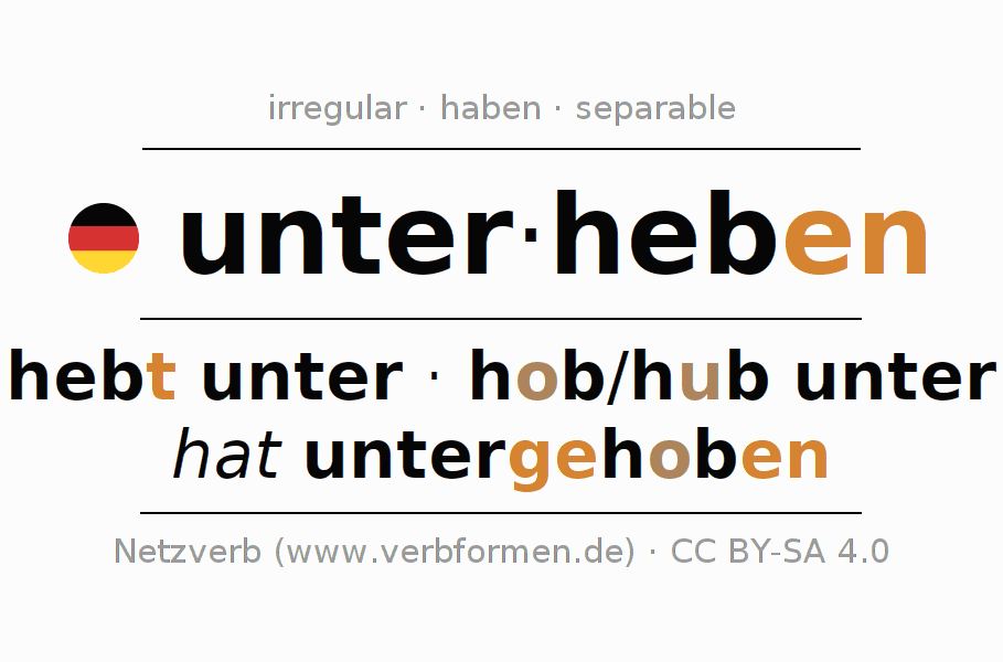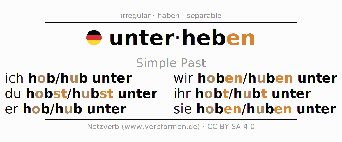 The conjugation of unterheben (fold in) in the past tense is ich hob/hub unter, du hobst/hubst unter, er hob/hub unter, wir hoben/huben unter, ihr hobt/hubt unter, sie hoben/huben unter. As an irregular, strong verb with ablaut -o/u- the preterite stem hob/hub- is used. The preterite endings -st, -en, -t, -en are appended to this stem. The 1st and 3rd person singular have no endings.The prefix unter- of unterheben is separated.The conjugation of these forms conforms to the grammatical rules for verbs in the past tense. Comments ☆