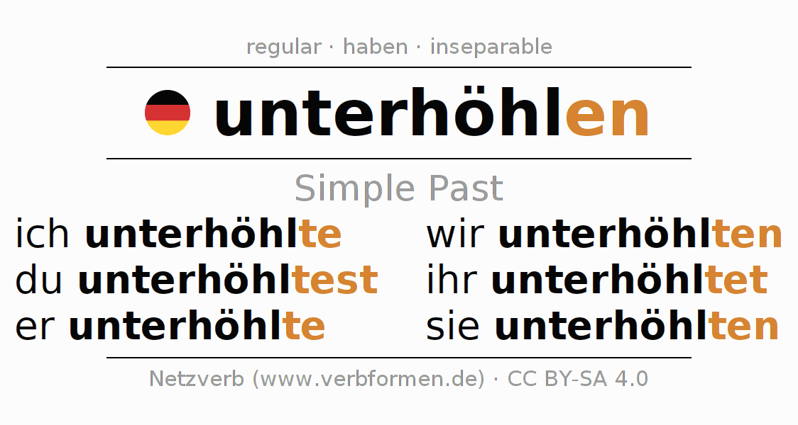 The conjugation of unterhöhlen (undermine, erode) in the past tense is ich unterhöhlte, du unterhöhltest, er unterhöhlte, wir unterhöhlten, ihr unterhöhltet, sie unterhöhlten. As a regular verb the unmodified stem höhl- is used. The preterite endings -te, -test, -te, -ten, -tet, -ten are appended to this stem.The conjugation of these forms conforms to the grammatical rules for verbs in the past tense. Comments ☆