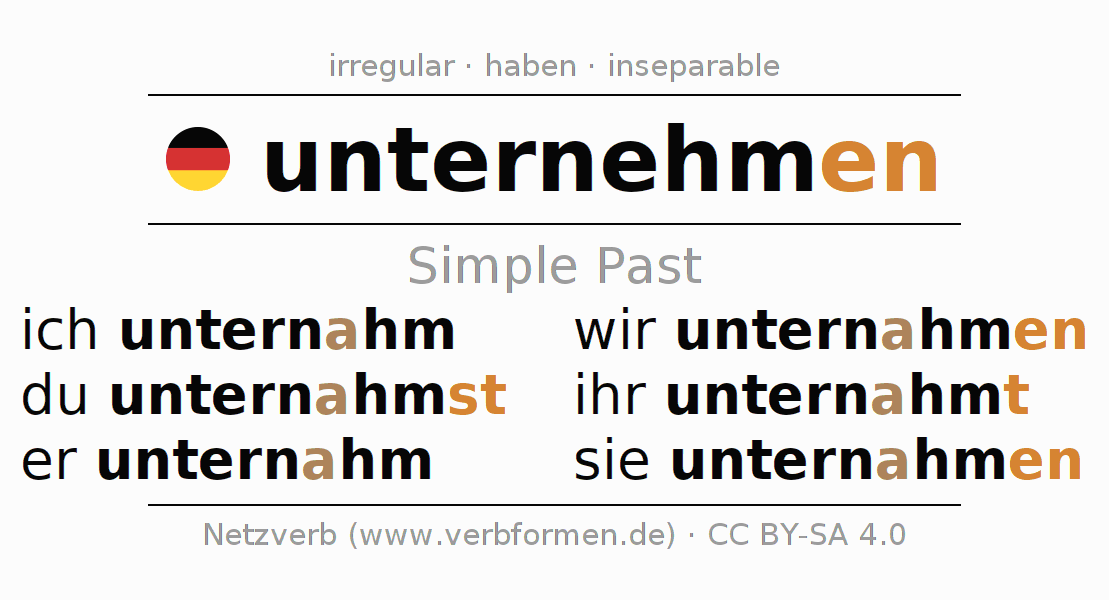 The conjugation of unternehmen (undertake, do) in the past tense is ich unternahm, du unternahmst, er unternahm, wir unternahmen, ihr unternahmt, sie unternahmen. As an irregular, strong verb with ablaut -a- the preterite stem nahm- is used. The preterite endings -st, -en, -t, -en are appended to this stem. The 1st and 3rd person singular have no endings.The conjugation of these forms conforms to the grammatical rules for verbs in the past tense. Comments ☆