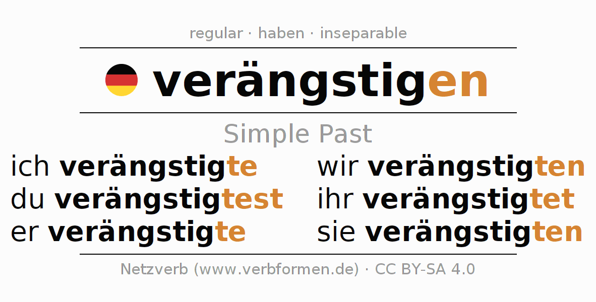 The conjugation of verängstigen (frighten, scare) in the past tense is ich verängstigte, du verängstigtest, er verängstigte, wir verängstigten, ihr verängstigtet, sie verängstigten. As a regular verb the unmodified stem ängstig- is used. The preterite endings -te, -test, -te, -ten, -tet, -ten are appended to this stem.The conjugation of these forms conforms to the grammatical rules for verbs in the past tense. Comments ☆