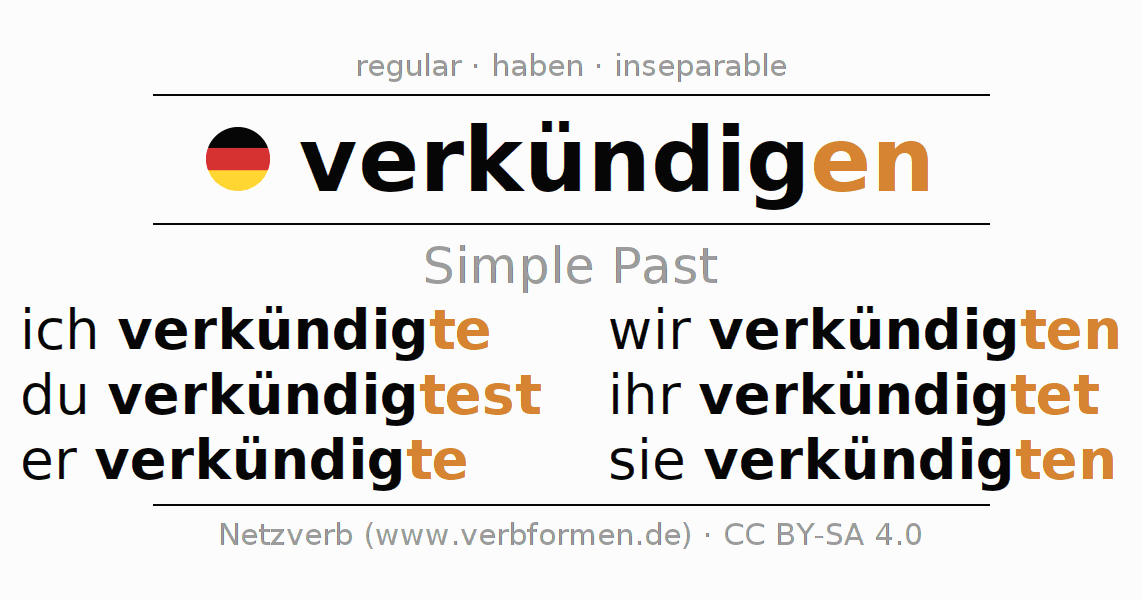 The conjugation of verkündigen (proclaim, announce) in the past tense is ich verkündigte, du verkündigtest, er verkündigte, wir verkündigten, ihr verkündigtet, sie verkündigten. As a regular verb the unmodified stem kündig- is used. The preterite endings -te, -test, -te, -ten, -tet, -ten are appended to this stem.The conjugation of these forms conforms to the grammatical rules for verbs in the past tense. Comments ☆