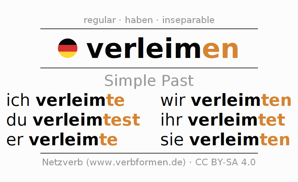 The conjugation of verleimen (bond, glue) in the past tense is ich verleimte, du verleimtest, er verleimte, wir verleimten, ihr verleimtet, sie verleimten. As a regular verb the unmodified stem leim- is used. The preterite endings -te, -test, -te, -ten, -tet, -ten are appended to this stem.The conjugation of these forms conforms to the grammatical rules for verbs in the past tense. Comments ☆