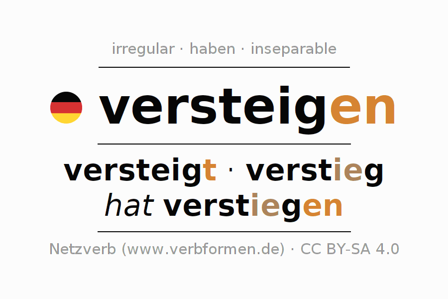 The conjugation of versteigen (boldly assert, conclude) in the past tense is ich verstieg, du verstiegst, er verstieg, wir verstiegen, ihr verstiegt, sie verstiegen. As an irregular, strong verb with ablaut -ie- the preterite stem stieg- is used. The preterite endings -st, -en, -t, -en are appended to this stem. The 1st and 3rd person singular have no endings.The conjugation of these forms conforms to the grammatical rules for verbs in the past tense. Comments ☆