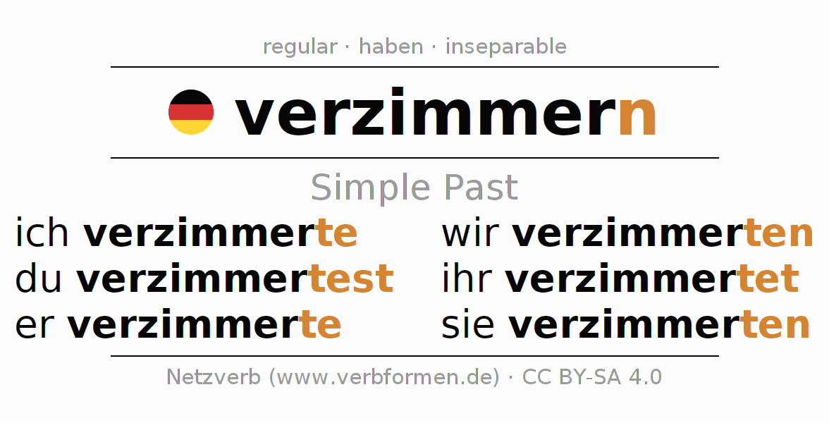The conjugation of verzimmern (support, board) in the past tense is ich verzimmerte, du verzimmertest, er verzimmerte, wir verzimmerten, ihr verzimmertet, sie verzimmerten. As a regular verb the unmodified stem zimmer- is used. The preterite endings -te, -test, -te, -ten, -tet, -ten are appended to this stem.The conjugation of these forms conforms to the grammatical rules for verbs in the past tense. Comments ☆