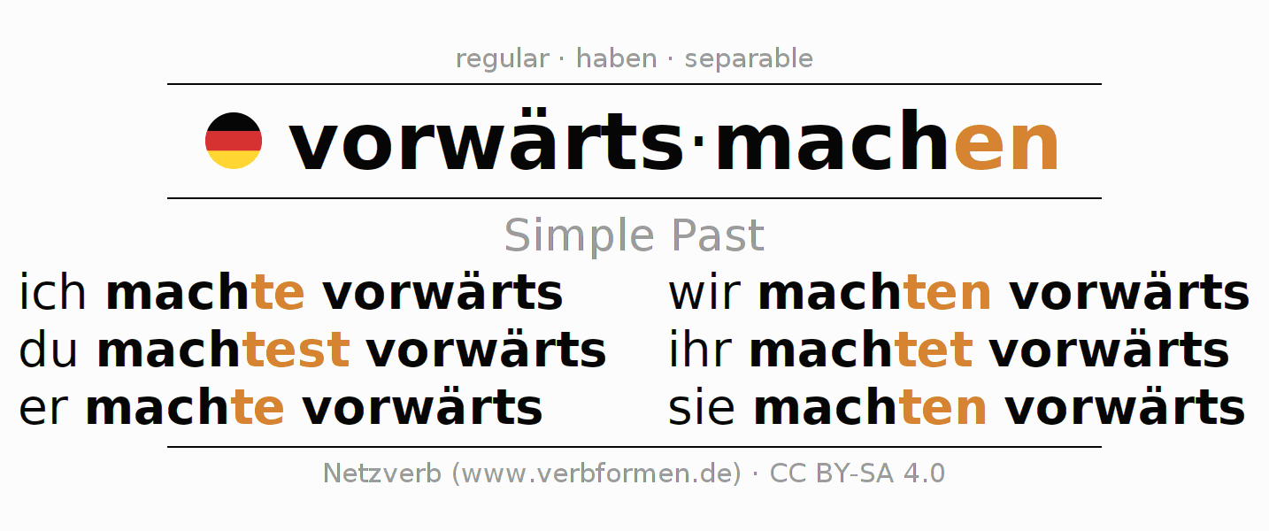 The conjugation of vorwärtsmachen (hurry, move quickly) in the past tense is ich machte vorwärts, du machtest vorwärts, er machte vorwärts, wir machten vorwärts, ihr machtet vorwärts, sie machten vorwärts. As a regular verb the unmodified stem mach- is used. The preterite endings -te, -test, -te, -ten, -tet, -ten are appended to this stem.The prefix vorwärts- of vorwärtsmachen is separated.The conjugation of these forms conforms to the grammatical rules for verbs in the past tense. Comments ☆