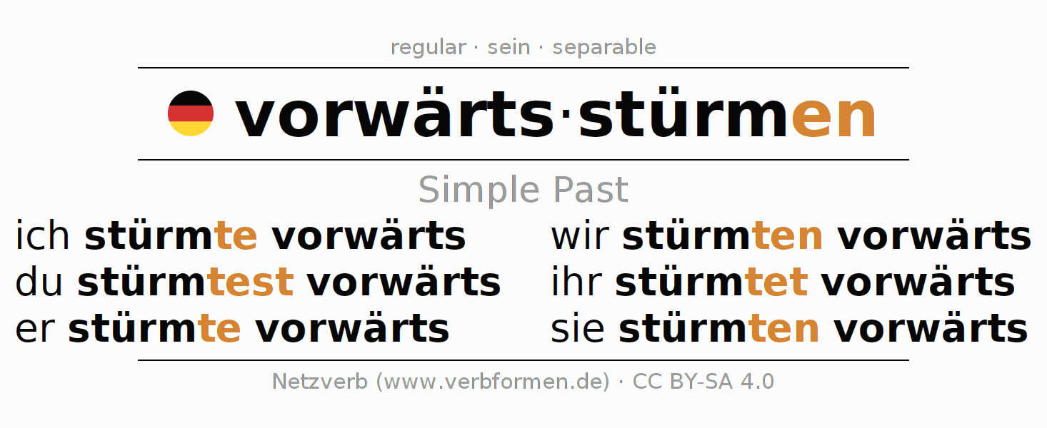 The conjugation of vorwärtsstürmen (rush forward, storm forward) in the past tense is ich stürmte vorwärts, du stürmtest vorwärts, er stürmte vorwärts, wir stürmten vorwärts, ihr stürmtet vorwärts, sie stürmten vorwärts. As a regular verb the unmodified stem stürm- is used. The preterite endings -te, -test, -te, -ten, -tet, -ten are appended to this stem.The prefix vorwärts- of vorwärtsstürmen is separated.The conjugation of these forms conforms to the grammatical rules for verbs in the past tense. Comments ☆