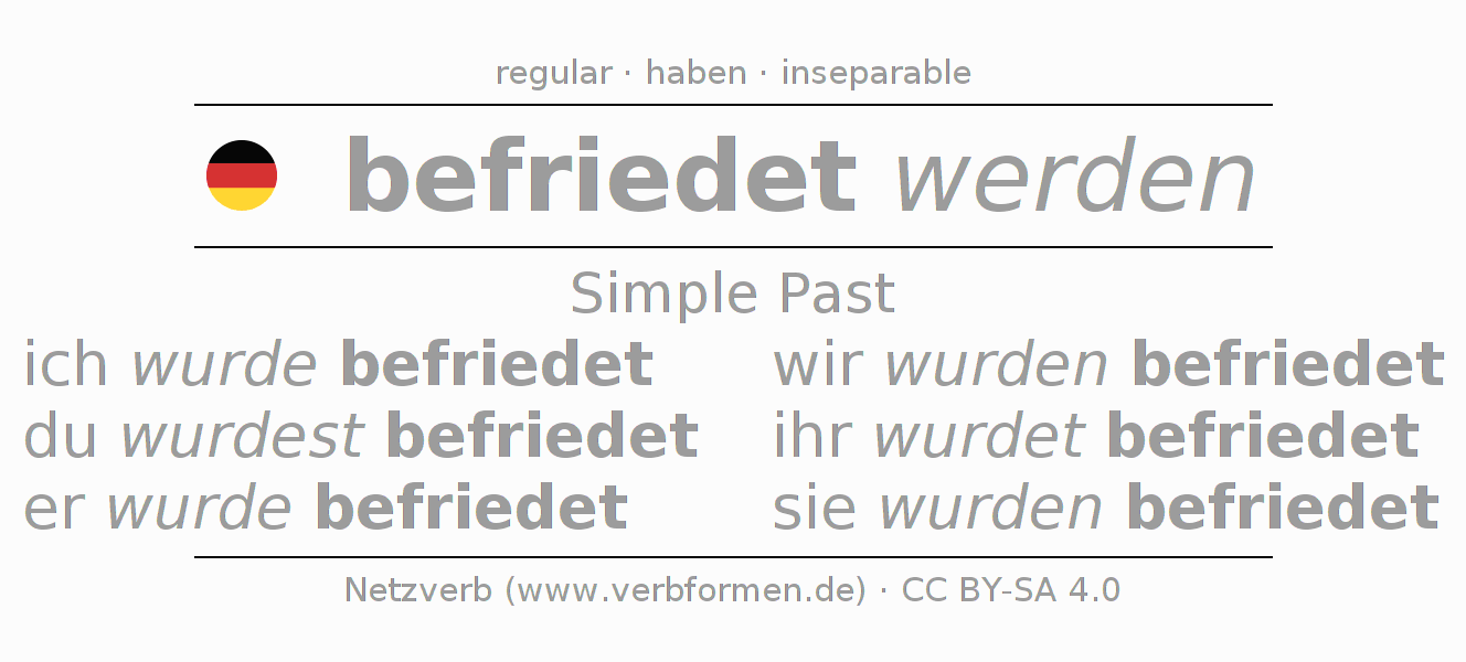 The conjugation of befrieden in Imperfect Indicative Past Passive is ich wurde befriedet, du wurdest befriedet, er wurde befriedet, wir wurden befriedet, ihr wurdet befriedet, sie wurden befriedet.The conjugation corresponds to certain grammatical rules. Likewise the requirements for the conjugation of the simple verb forms of befrieden in Imperfect. Comments ☆