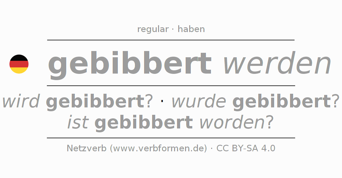 The conjugation of bibbern in Imperfect Indicative Past Passive is wurde ich gebibbert?, wurdest du gebibbert?, wurde er gebibbert?, wurden wir gebibbert?, wurdet ihr gebibbert?, wurden sie gebibbert?.The conjugation corresponds to certain grammatical rules. Likewise the requirements for the conjugation of the simple verb forms of bibbern in Imperfect. Comments ☆