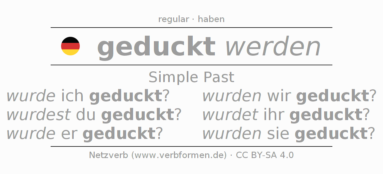 The conjugation of ducken in Imperfect Indicative Past Passive is wurde ich geduckt?, wurdest du geduckt?, wurde er geduckt?, wurden wir geduckt?, wurdet ihr geduckt?, wurden sie geduckt?.The conjugation corresponds to certain grammatical rules. Likewise the requirements for the conjugation of the simple verb forms of ducken in Imperfect. Comments ☆
