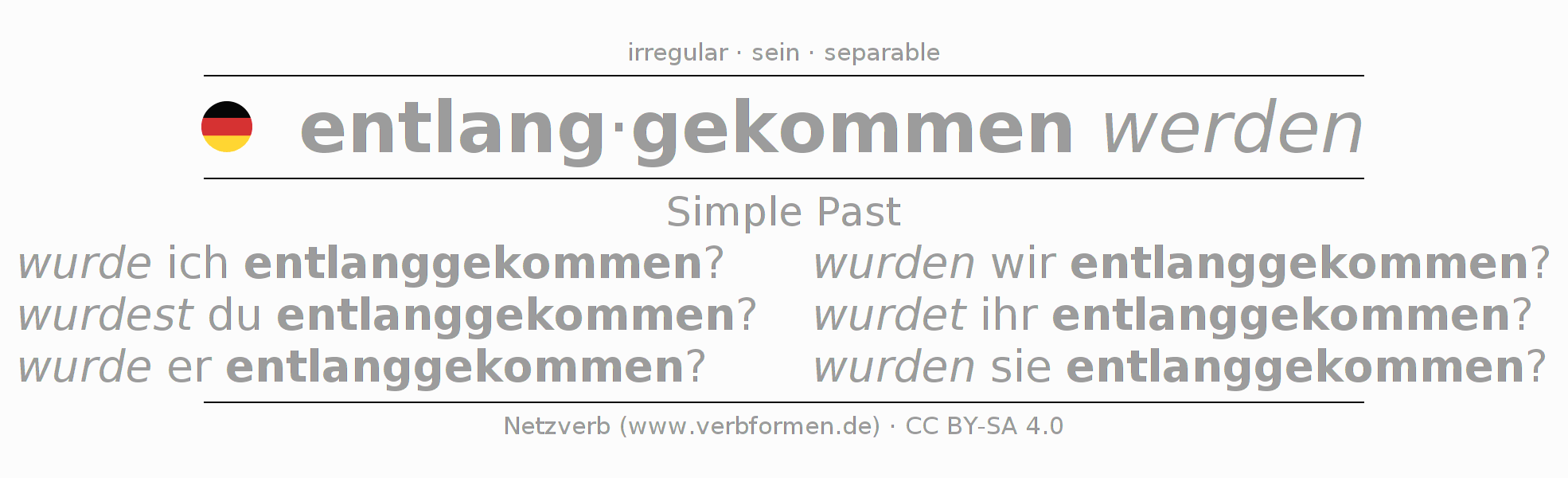 The conjugation of entlangkommen in Imperfect Indicative Past Passive is wurde ich entlanggekommen?, wurdest du entlanggekommen?, wurde er entlanggekommen?, wurden wir entlanggekommen?, wurdet ihr entlanggekommen?, wurden sie entlanggekommen?.The conjugation corresponds to certain grammatical rules. Likewise the requirements for the conjugation of the simple verb forms of entlangkommen in Imperfect. Comments ☆