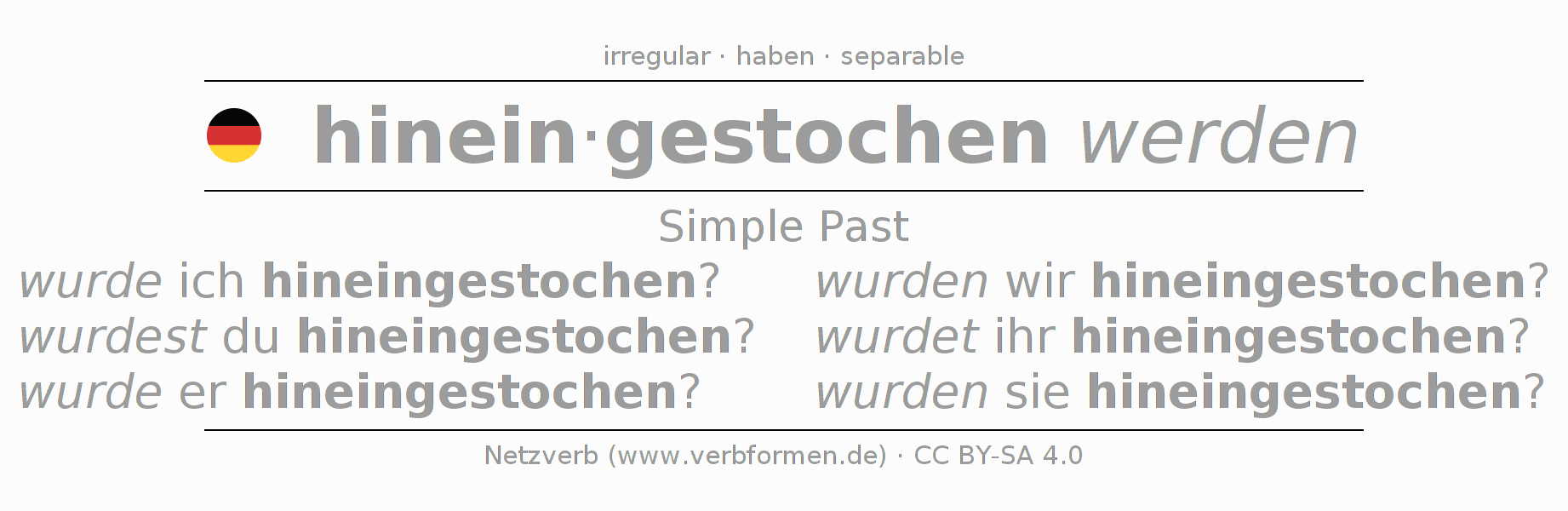 The conjugation of hineinstechen in Imperfect Indicative Past Passive is wurde ich hineingestochen?, wurdest du hineingestochen?, wurde er hineingestochen?, wurden wir hineingestochen?, wurdet ihr hineingestochen?, wurden sie hineingestochen?.The conjugation corresponds to certain grammatical rules. Likewise the requirements for the conjugation of the simple verb forms of hineinstechen in Imperfect. Comments ☆