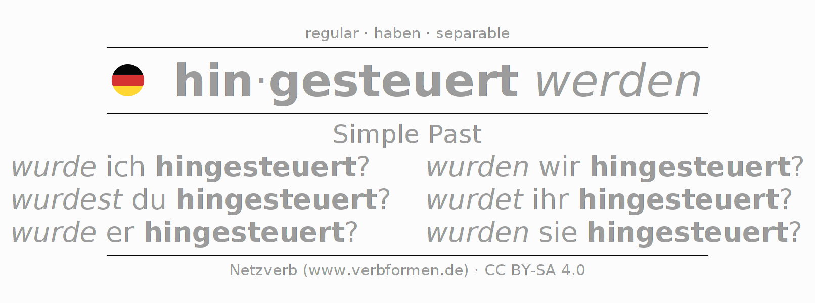 The conjugation of hinsteuern in Imperfect Indicative Past Passive is wurde ich hingesteuert?, wurdest du hingesteuert?, wurde er hingesteuert?, wurden wir hingesteuert?, wurdet ihr hingesteuert?, wurden sie hingesteuert?.The conjugation corresponds to certain grammatical rules. Likewise the requirements for the conjugation of the simple verb forms of hinsteuern in Imperfect. Comments ☆
