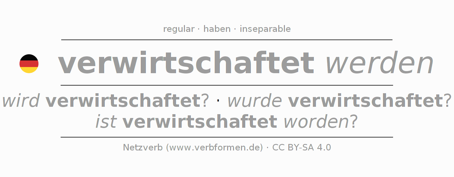 The conjugation of verwirtschaften in Imperfect Indicative Past Passive is wurde ich verwirtschaftet?, wurdest du verwirtschaftet?, wurde er verwirtschaftet?, wurden wir verwirtschaftet?, wurdet ihr verwirtschaftet?, wurden sie verwirtschaftet?.The conjugation corresponds to certain grammatical rules. Likewise the requirements for the conjugation of the simple verb forms of verwirtschaften in Imperfect. Comments ☆