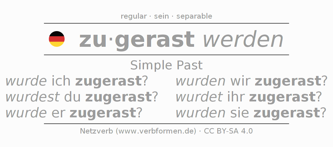 The conjugation of zurasen in Imperfect Indicative Past Passive is wurde ich zugerast?, wurdest du zugerast?, wurde er zugerast?, wurden wir zugerast?, wurdet ihr zugerast?, wurden sie zugerast?.The conjugation corresponds to certain grammatical rules. Likewise the requirements for the conjugation of the simple verb forms of zurasen in Imperfect. 1Comment ☆1.0