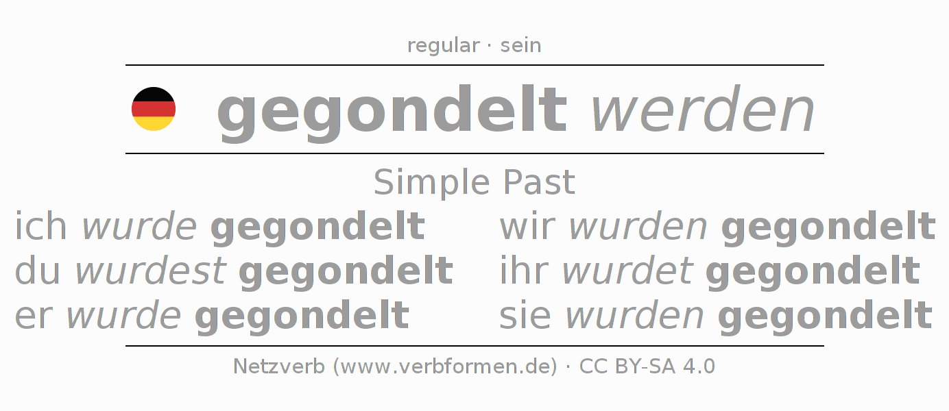 The conjugation of gondeln in Imperfect Indicative Past Passive is ich wurde gegondelt, du wurdest gegondelt, er wurde gegondelt, wir wurden gegondelt, ihr wurdet gegondelt, sie wurden gegondelt.The conjugation corresponds to certain grammatical rules. Likewise the requirements for the conjugation of the simple verb forms of gondeln in Imperfect. Comments ☆