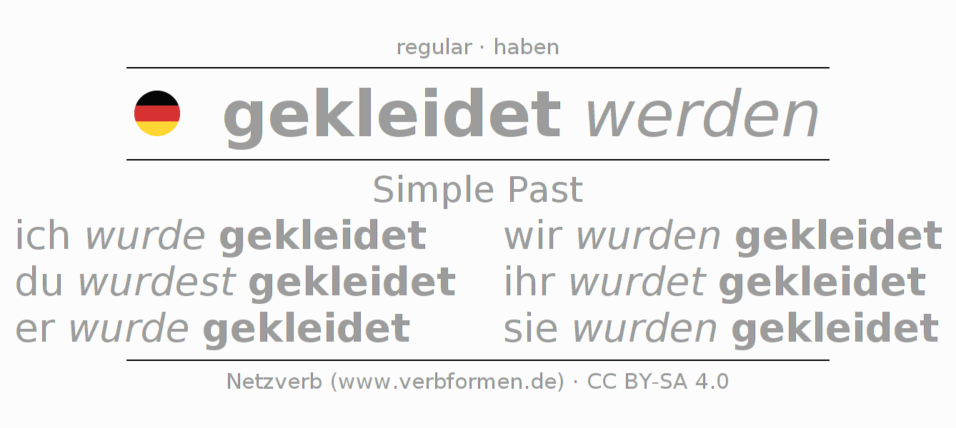 The conjugation of kleiden in Imperfect Indicative Past Passive is ich wurde gekleidet, du wurdest gekleidet, er wurde gekleidet, wir wurden gekleidet, ihr wurdet gekleidet, sie wurden gekleidet.The conjugation corresponds to certain grammatical rules. Likewise the requirements for the conjugation of the simple verb forms of kleiden in Imperfect. Comments ☆