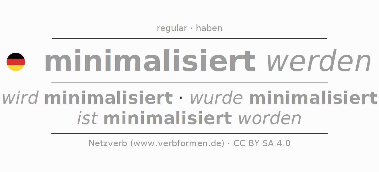 The conjugation of minimalisieren in Imperfect Indicative Past Passive is ich wurde minimalisiert, du wurdest minimalisiert, er wurde minimalisiert, wir wurden minimalisiert, ihr wurdet minimalisiert, sie wurden minimalisiert.The conjugation corresponds to certain grammatical rules. Likewise the requirements for the conjugation of the simple verb forms of minimalisieren in Imperfect. Comments ☆