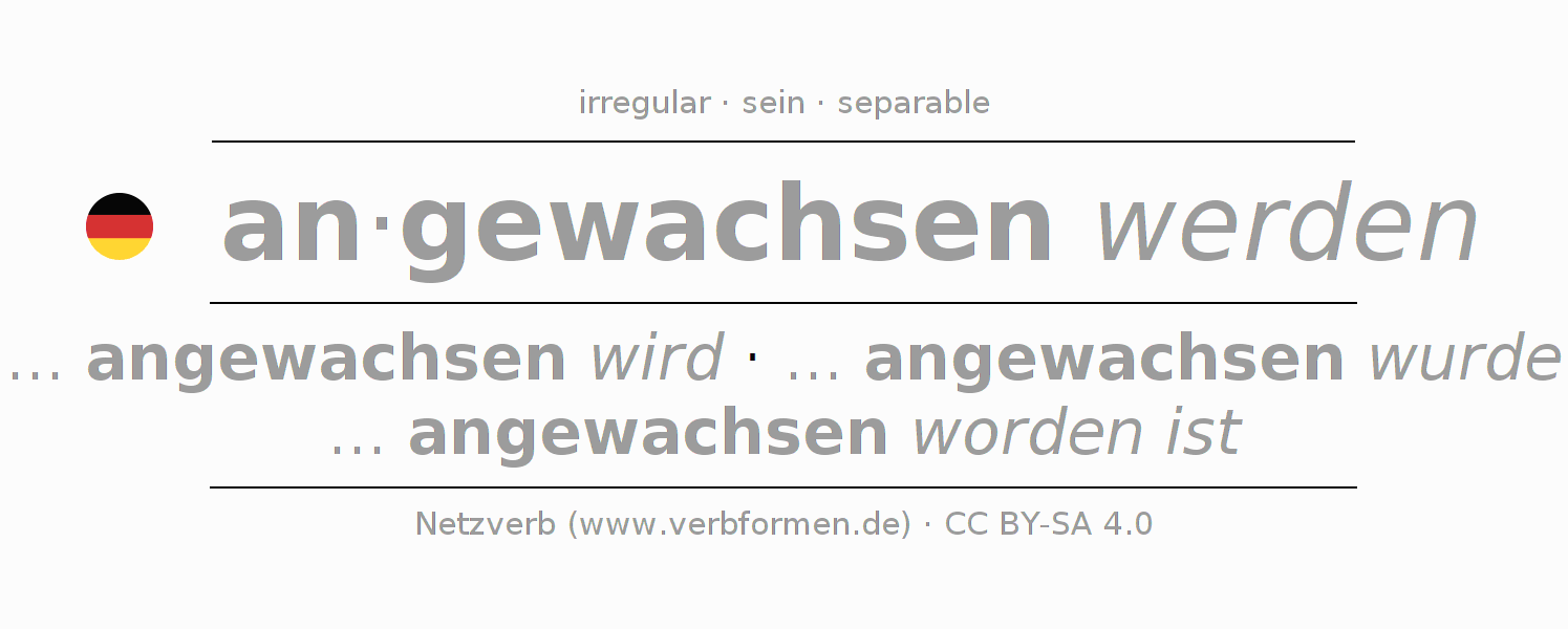 The conjugation of anwachsen in Imperfect Indicative Past Passive is ... ich angewachsen wurde, ... du angewachsen wurdest, ... er angewachsen wurde, ... wir angewachsen wurden, ... ihr angewachsen wurdet, ... sie angewachsen wurden.The conjugation corresponds to certain grammatical rules. Likewise the requirements for the conjugation of the simple verb forms of anwachsen in Imperfect. Comments ☆