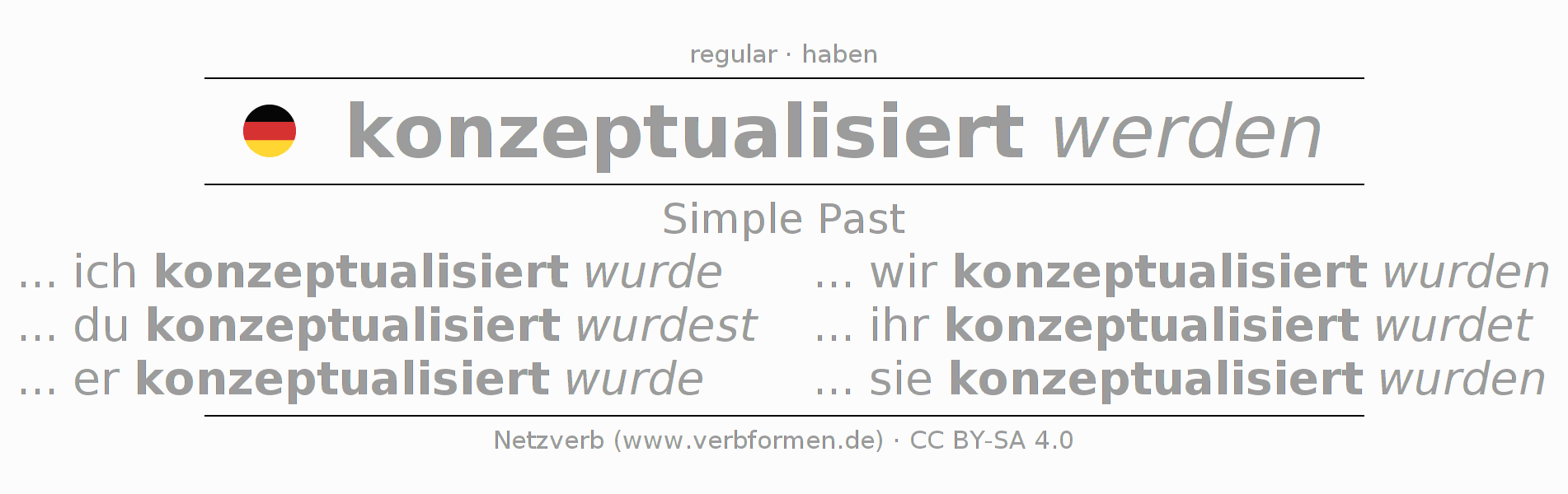 The conjugation of konzeptualisieren in Imperfect Indicative Past Passive is ... ich konzeptualisiert wurde, ... du konzeptualisiert wurdest, ... er konzeptualisiert wurde, ... wir konzeptualisiert wurden, ... ihr konzeptualisiert wurdet, ... sie konzeptualisiert wurden.The conjugation corresponds to certain grammatical rules. Likewise the requirements for the conjugation of the simple verb forms of konzeptualisieren in Imperfect. Comments ☆