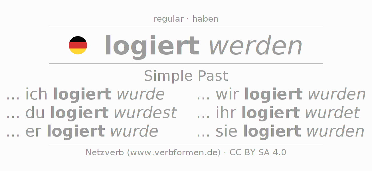 The conjugation of logieren in Imperfect Indicative Past Passive is ... ich logiert wurde, ... du logiert wurdest, ... er logiert wurde, ... wir logiert wurden, ... ihr logiert wurdet, ... sie logiert wurden.The conjugation corresponds to certain grammatical rules. Likewise the requirements for the conjugation of the simple verb forms of logieren in Imperfect. Comments ☆